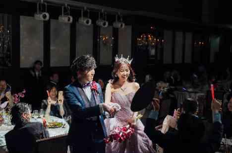 ドレス当てクイズのためのサイリウムを披露宴開始前に選んでいただき、再入場直前に各テーブルにファンサービスのオリジナルうちわやアイドルの公式うちわを配布。新婦が好きなアイドルのウエディングソングで再入場しました。いつもは応援する側の自分達がファンサービスをする不思議な感覚とサイリウムの鮮やかな景色が思い出に残っています。