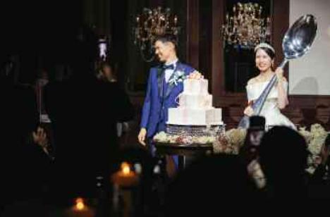 ウェディングケーキはプレゼントボックスのようなリボンのデザインにしました。理想のイメージを伝えると的確な提案をしてもらい、全体の装飾を控えめにすることで大きなリボンの装飾が目立つ素敵なケーキになりました。ファーストバイトでは120cmのビッグスプーンを使用。後ろの参列者の方からも見やすく、インパクトもあり、とても盛り上がったファーストバイトになりました。