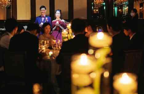 落ち着いた雰囲気の会場で行うキャンドルリレーは、最低限の照明の下でゲスト全員が手にしたキャンドルの火がゆらめき、全員で火を吹き消すブローアウトセレモニーまでまさに幻想的。このキャンドルは新婦のカラードレスの色当てクイズとして予想した色のキャンドルを選んでもらうというもので、様々な色のキャンドルが灯る光景は圧巻です。
