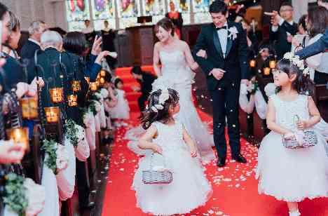 大聖堂、ロイヤルステンドグラス、赤いバージンロードなど「"女性の憧れ"が詰まったチャペルに感激した」と花嫁様からも大絶賛。 退場の際には可愛らしい二人のフラワーガールちゃんと一緒にゲストの皆様の祝福を受けられました。