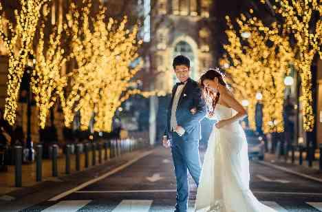 風情ある旧居留地に煌びやかに灯る数々のライト。バックには神戸セントモルガン教会の外観がライトアップされています! とても印象的な写真が残せるこの地で前撮りをされたお2人。結婚式場内では撮影できない、素敵なお写真をたくさん残して頂きました!