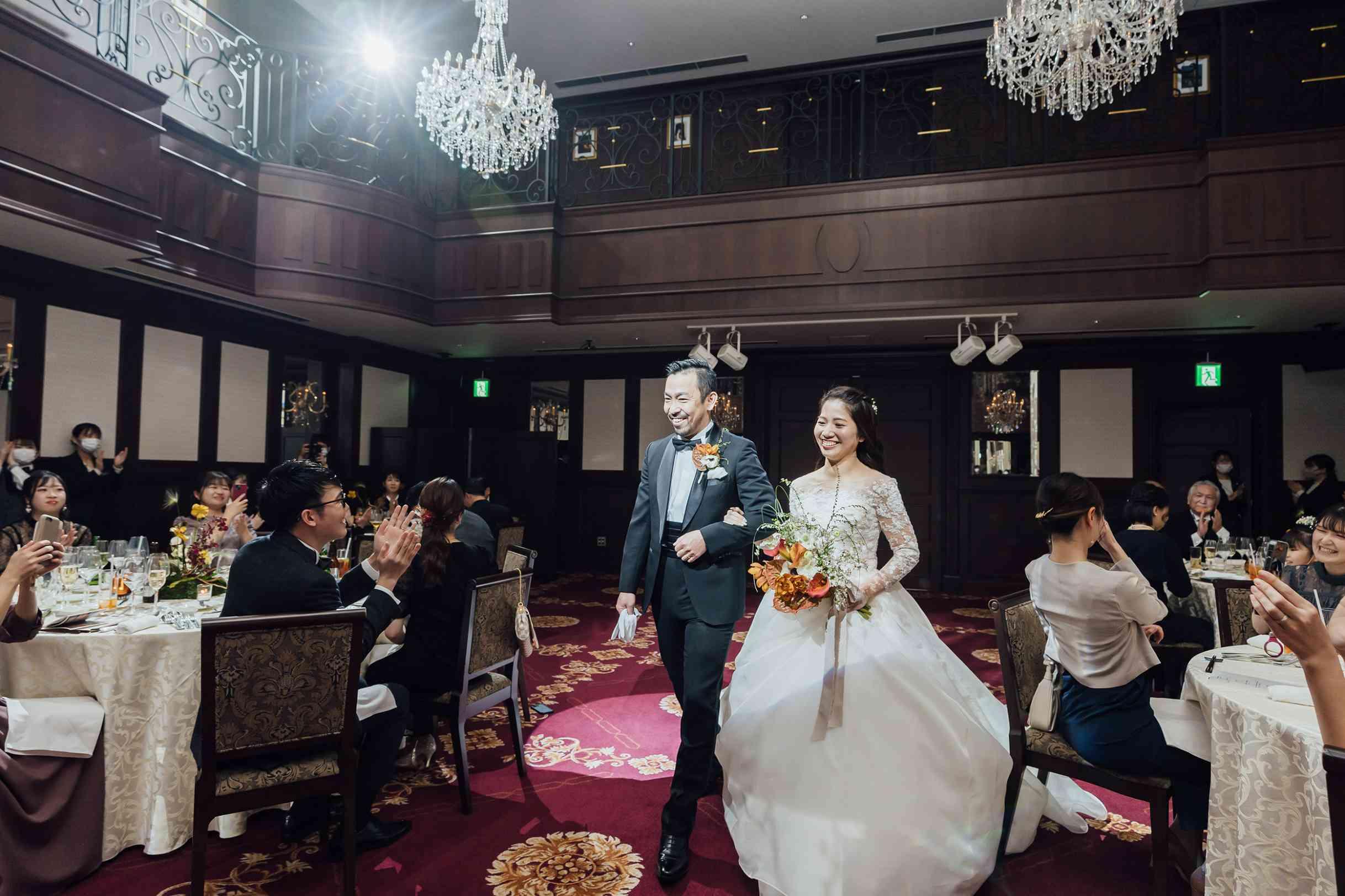 シャンデリアが映えるクラシカルな空間。会場装花やテーブルクロスなど専属のフラワーコーディネーターが新郎新婦様のお好みに合わせてご提案。お二人のこだわりがつまった場所で大切なゲストと思い出の時間を。