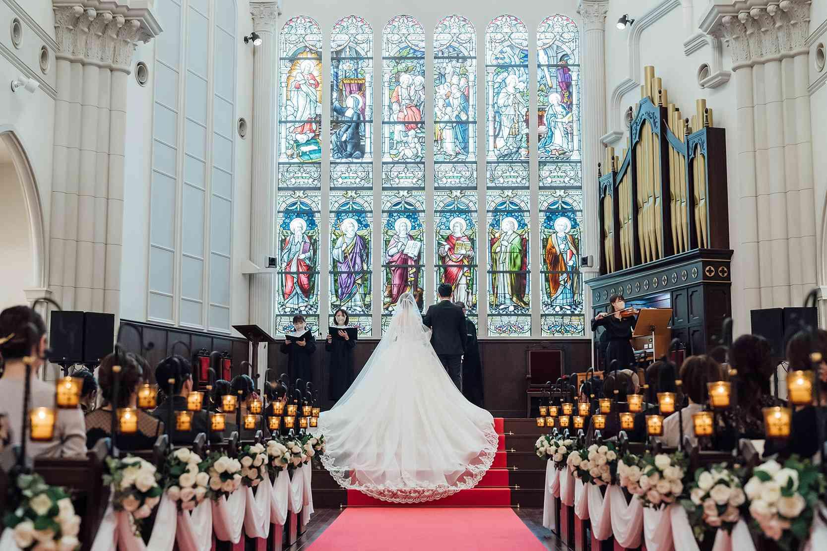 200年前に造られた芸術的価値の高いロイヤルステンドグラス 実在したフランスの教会より移築され、自然光差し幻想的な雰囲気となる。 パイプオルガンやヴァイオリンの演奏と共に温かい挙式が叶う本格派大聖堂。