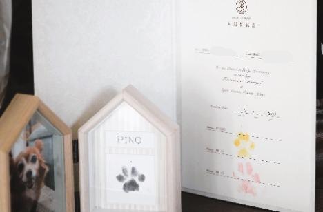 ご新婦様のご実家にいてるワンちゃんにもたくさんご参加いただきたい!!そんな思いが、いっぱい詰まったWeddingをお考えになられました♡当日参加ができなかったワンちゃんはお写真でご参加☆おふたりの結婚証明書には、ふたり分の肉球スタンプを押して結婚の証人に。癒しと愛しさにつつまれた、あたたかい結婚式となりました。
