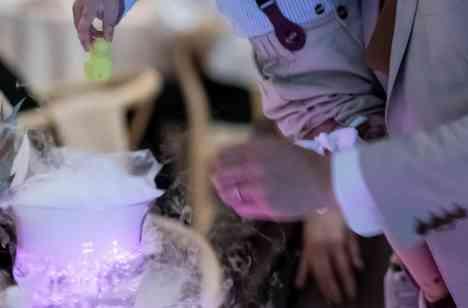 披露宴ではお色直し後に各テーブルを回って、光の演出をお子様と一緒に3名様で行いました! お子様も一緒とのことで、和やかな雰囲気の中演出を行うことができ、お子様との思い出もできましたね!! また、進行の1つで行ったドキドキクラッカー演出では、代表者の方に挑戦していただき、会場全体が盛り上がりました。