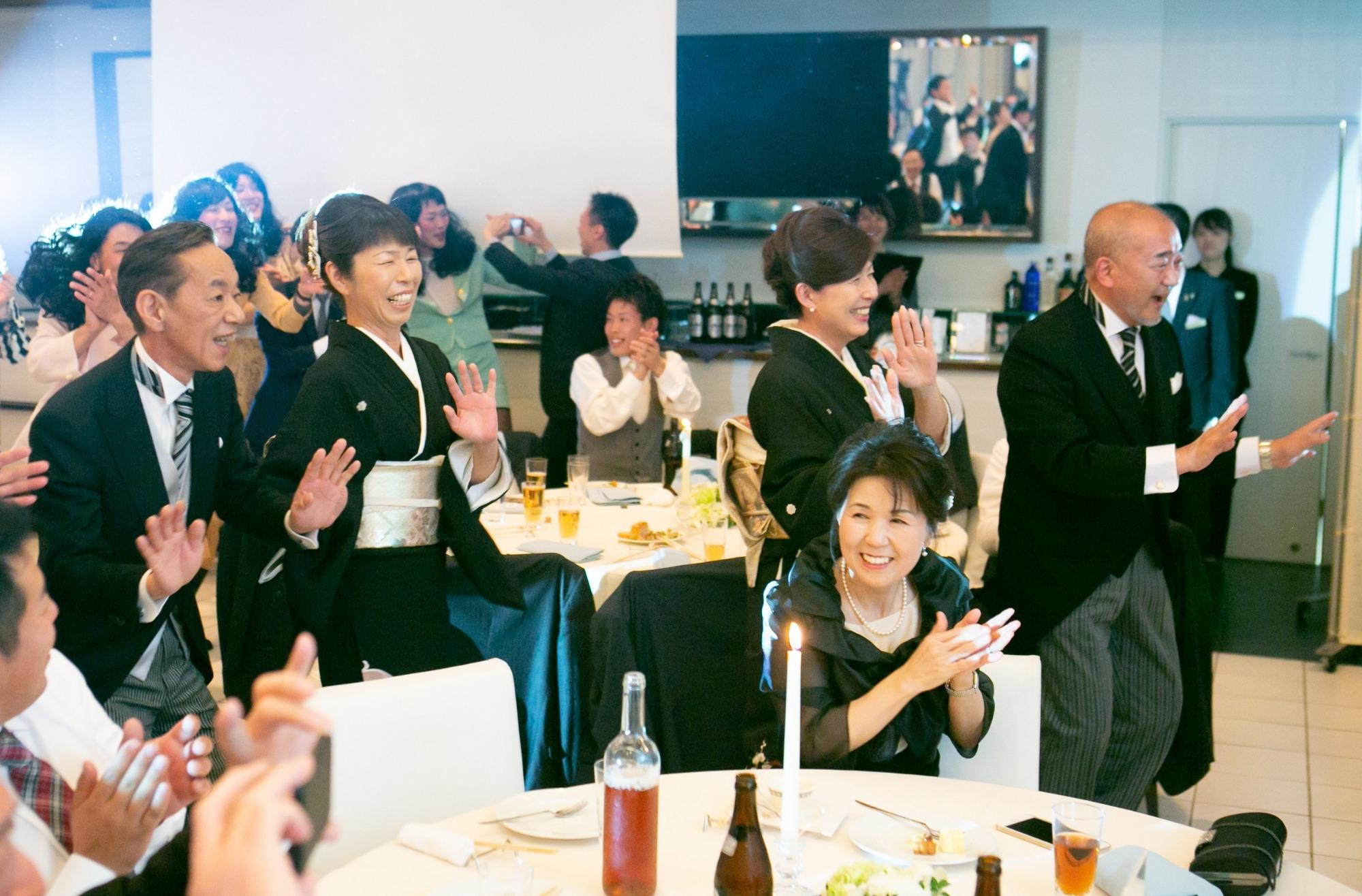 おふたりの披露宴の後半には、大切な友人からの余興がありました。もちろん内容はおふたりにはサプライズ。そのうちの一つの余興のフラッシュモブには、なんと両家の親御様が登場したのです!!!それにはおふたりもビックリ!内緒で友人の皆様との練習を何回も行い、その姿を見たおふたりは本当にステキな笑顔をされていました♪