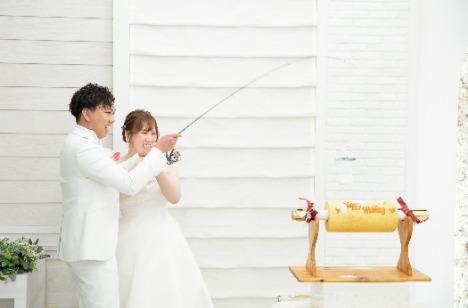 ケーキ入刀の前におふたりでバウムクーヘンに仕上げをしました◎ 新郎様がだいすきな趣味の釣りをイメージして、新郎様の釣竿をお持ち込みいただき、粉砂糖を振って完成させました♡ 見たことのないオリジナル演出に、ゲストのみなさまもカメラ片手に興味津々˖✧ おふたりも、ゲストのみなさまの反応に嬉しそうにされていました♡ 仕上げをしたあとは大きな口でおふたりで盛大にかぶりつきました✩