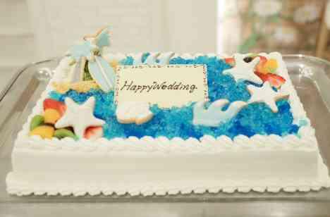 定番のケーキ入刀はおふたりの大好きな海をモチーフにオリジナルでつくりました!!! やしの木や波、ヒトデや貝、サーフィンなど、おふたりの好きなものだけでできたウェディングケーキはおふたりのお気に入りです♡♡♡ リヴァージュブランではオリジナルケーキも承っております! どんなご要望もぜひお申し付けくださいませ!! シェフが一緒に相談に乗ってくれます◎