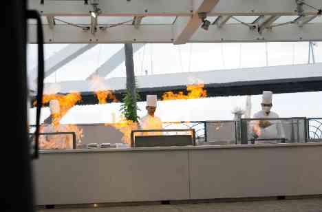 リヴァージュブランの一番の特徴「シェフズダイニング」!! 今回は「カーテンオープン!」のコールをおふたりにしていただきました! オープンテラスキッチンでのシェフからのフランベにゲストのみなさまは思わず「おおおっっ!!」の声が…! おふたりも嬉しそうにその様子をご覧になっていました(^^♪ おふたりもゲストも楽しめる演出「シェフズダイニング」です!!