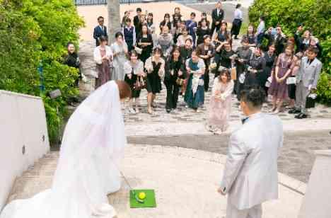 新郎様の趣味だったゴルフを最近新婦様も始められたとのことで、アフターセレモニーではゴルフを取り入れた演出を行いました! それぞれがショットをし、ゲットした方へプレゼントをご用意されました! 事前に式場に練習にも来られたおふたり☺ 本番では無事きれいに打つことができました◎ 成功して満足そうなおふたりでございました♡