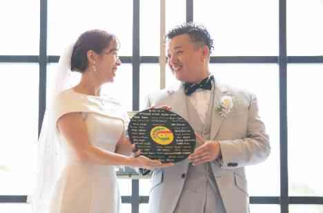 新郎様のお兄様よりプレゼントでいただいたレコードを結婚証明書としてご用意されました◎ レコードにはゲストのみなさまに署名をいただきました! おふたりも署名をして、みなさまに披露ができて、完成したレコード証明書をみて嬉しそうなおふたりでした♡ みなさまのぜひ思い出の品や趣味グッズを結婚証明書にしてみてはいかがでしょうか☺♡