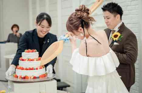 こちらも新郎新婦様に大人気の演出の1つ「ファーストバイト」でございます! 新婦様がお持ちされているのはなんと...お顔よりも大きなビックスプーン!!! 後ろで待ち構えている新郎様もびっくりです(笑) 「一生美味しいお料理を作ります」と新婦様の愛情と気持ちを込め、いっぱいのケーキを新郎様のお口にお運びいただきました。