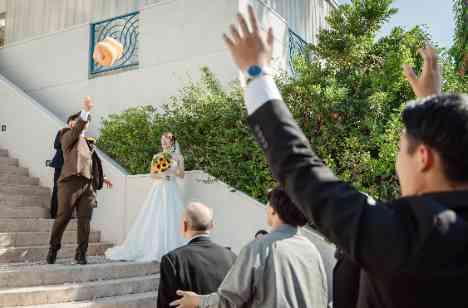 アフターセレモニーとして多いのが、新婦様から女性ゲストのみなさまへのブーケトスですが...こちらは新郎様から男性ゲストのみなさまへのトスでございます。 新郎様が投げられているのは...お肉のぬいぐるみです♪ お肉をキャッチされた方には「黒毛和牛」のプレゼントです!! ゲストのみなさまにご参加いただける、とても盛り上がりのある演出ですね!