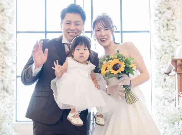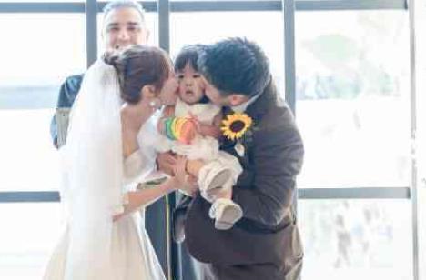 新郎新婦様のお子様を間にはさんで、ほっぺにウェディンキス! ゲストのみなさまの前で、とっても素敵なウェディングキスで温かな空気に包まれました。 ぱぱとままにキスされ、お子様もとても嬉しそうです! 素敵な3人のお顔がばっちりカメラに収められていますね☆彡 また、大人になったお子様と3人で、見返す時が来るのが楽しみです。 愛が溢れた1枚でした♪