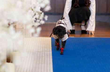 新郎新婦様の愛犬「ごえもんくん」が、大切な指輪をおふたりのもとへお届けくださいました。 会場は、ゲストのみなさまの暖かなまなざしに包まれています。 かっこいいタキシードを身にまとい、一歩一歩、慎重に運ぶその健気なお姿は、なんとも愛らしく、思わず笑顔がこぼれるひとときでございます♡ ごえもんくんの頑張る姿に、会場全体がやさしい空気に包まれ、心温まる素敵な時間となりました!