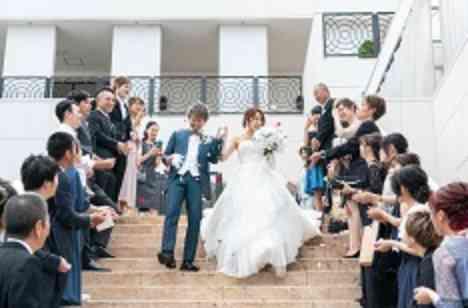 ご新婦様のおばあ様とのご入場、ベールダウンで感動に包まれた会場…。その後はおふたりらしい、笑顔があふれる中での大階段でのフラワーシャワーを行い、目録付きぬいぐるみトス♪未婚の方限定のブーケトスではなく全員が参加できるものにすることで、とても盛り上がりました!