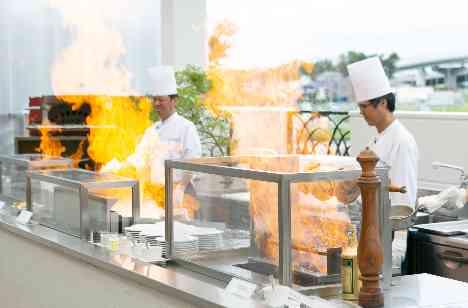 ゲストに楽しんでいただけるパーティをお考えのおふたりは、リヴァージュブランオリジナルのお料理スタイル“シェフズダイニング”をチョイス。フランベから始まりシェフが目の前で調理するこのスタイルに、みなさま笑顔でお楽しみいただけました。
