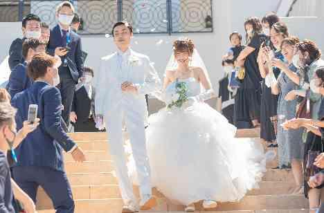 花の香りで周囲を清め、幸せを妬む悪魔からおふたりを守るおまじないの意味合いが込められているフラワーシャワー。リヴァージュブランならではの大階段を使用し、晴天の下で新郎新婦もゲストも笑顔が溢れる素敵な時間となりました。