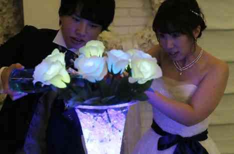 ゲストの席へご用意していたバラを1本ずつメインの花瓶に入れていただき、おふたりが水を注ぐと青色と白色にバラが光るとてもロマンティックな演出。ご用意された11本のバラの花言葉は『最愛』。おふたりらしい素敵な意味合いを持つ演出となりました…♪