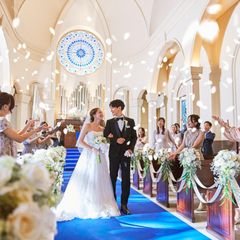 【憧れが叶う大聖堂】ドレスが映えるロイヤルブルーのチャペルで入場体験♪22mのバージンロード/13mの天井高!生演奏の音色が響く大聖堂は憧れの舞台♪天候に左右されずフラワーシャワーを楽しめる全天候型*