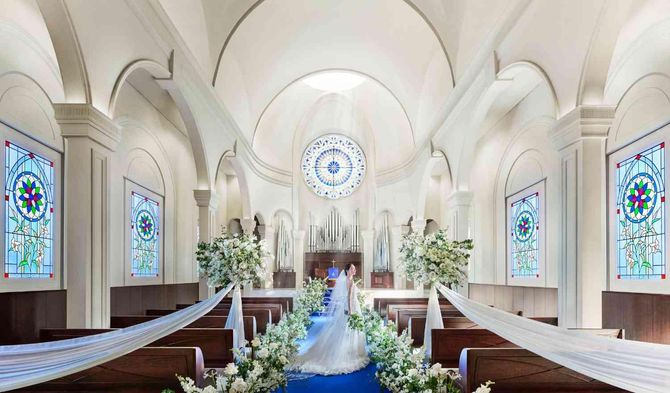 エリア屈指の大聖堂はステンドグラスの輝きと永遠を意味するロイヤルブルーのバージンロードが美しい。入場体験で感動の瞬間が味わえる!挙式が結ぶと自然光溢れる会場でアフターセレモニーへとご案内♪ブライダルフェアではフラワーシャワー体験も叶う!