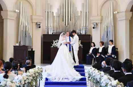 挙式直前に二人で作ったチャペルムービーが流れ、今までを振り返りながらバージンロードを歩きました。このタイミングでゲストの方々と対面するので新郎は緊張していましたが新婦は全然緊張していなかったようです(笑)私たちの衣装はお互いに白で、ロイヤルブルーのバージンロードとも相性が良かったと感じています。お世話になっているゲストの方々と作り上げることのできた最高の挙式になりました。
