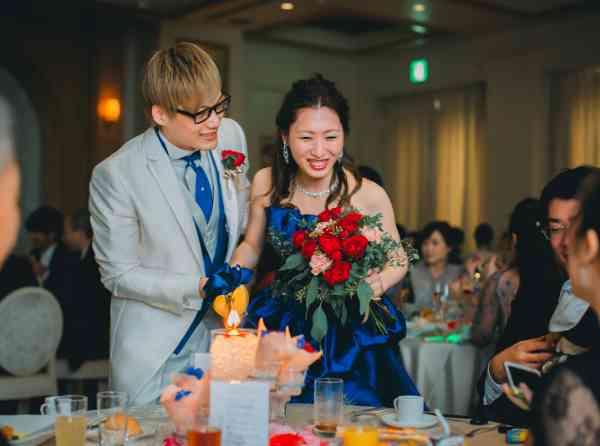 バージンロードには「誕生から今日の日まで新婦の人生を表す一本道」という意味があるそうです。ロイヤルブルーのバージンロードはとても長く感じましたが、今までの人生を思い出しながら一歩一歩、感謝の気持ちを噛みしめながら歩きました。曲も大好きな『the rose』に変更して頂き感動的な挙式になりました。退場した後はクロージングキスをし思い出に残るシーンとなりました。