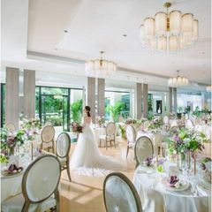 【ゲストがリラックスできる上質空間】キッチン併設の披露宴会場ではシェフのライブ演出もゲストに人気。ガーデンにそのままつながるパーティー空間は、輸入した拘りの調度品に囲まれた優雅なひと時を過ごせる。