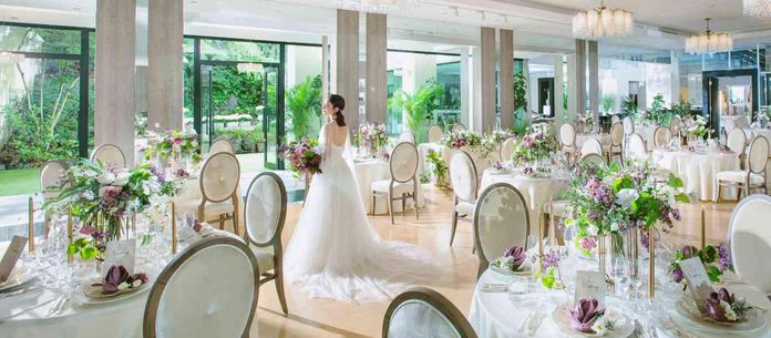 滝の流れるガーデンとひと続きの自然光があふれるパーティー会場