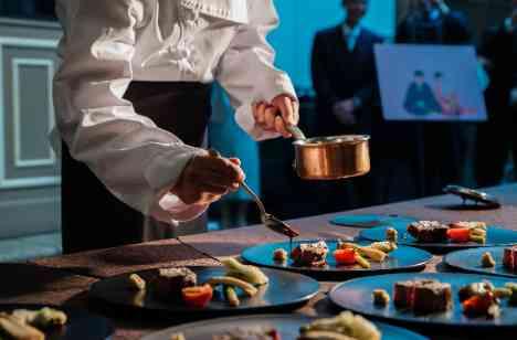お二人が当館を選んだ決め手の一つでもある、大切なゲストへの最上級のおもてなしが叶うこと。特にお料理を大事に考えていらっしゃり、担当プロデューサーがご提案したのは、シェフと一緒にご新郎様がコックコートを着て登場すること。そして、ゲストの目の前でシェフがお肉を焼き、ご新郎様がソースをかけて仕上げて、ゲストへサーブをいただきました。これにはゲストもびっくり!ゲストを大切に思うお二人だからこその演出でした