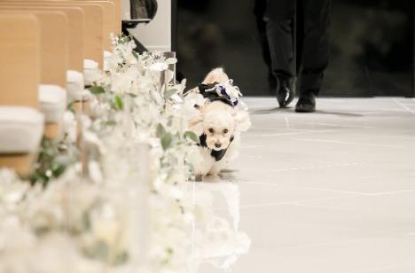 お二人が結婚式場探しをされる中で一番大事にされていたこと、それは愛犬と一緒に結婚式ができる会場!アプローズスクエア東京迎賓館はチャペルだけでなく、ご披露宴中も愛犬と一緒に過ごせるので、想い出のシーンが沢山残せそう!と式場見学1件目で運命の会場としてご成約をいただきました。愛犬もおめかしして、家族三人で誓うオリジナルウエディングを叶えました。