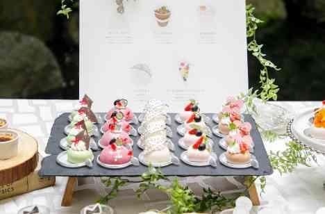 ガーデンでは愛犬と一緒にお写真を撮影したり、演出を沢山取り入れました。その中でもご新婦様がゲストのために一番こだわったのはデザートビュッフェ。披露宴の後半にガーデンにカラフルなデザートが並び、お二人からゲストへお披露目!ドレスに見立てたケーキはゲストに思い思いにデコレーションをしていただき、世界に一つのケーキを作り上げました。