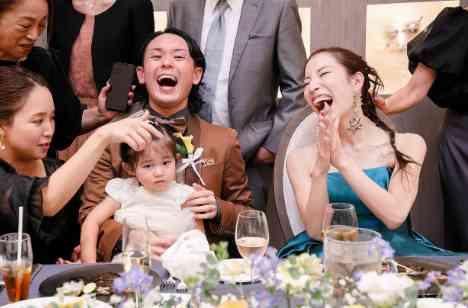 披露パーティーの間もふたりの周りは常に笑顔いっぱい。ゲストとも沢山写真を撮って、沢山おしゃべりもして大満足の1日に。派手な演出ばかりではなく、ふたりらしさをちりばめた特別な1日になりました。笑顔あり、感動も涙あり。貸切だからこそゆったりとした新興は、ふたりにとってもゲストにとっても忘れられない想い出に。