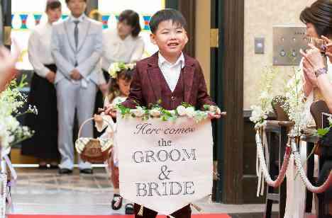 フラッグボーイ・フラワーガールの先導で始まった結婚式。ゲストからも可愛い!と歓声があがり、和やかなシーンとなりました。お二人のご緊張も少しほぐれたのではないでしょうか^^たくさんのゲストにも参加していただきたいという想いから、リングボーイをサプライズで選出!結婚証明書の作成に参加したり、ベル付きリボンワンズで結婚承認をしたり、たくさんのゲストに見守られながら、幸せ溢れる挙式となりました。