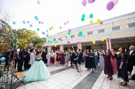 ゲスト全員と幸せを願ってバルーンリリースをいたしました。色とりどりのバルーンが青空に舞う様子はとても素敵でゲストもバルーンが見えなくなるまで、空を見上げておられましたね。小さなお子様からご年配の方まで年齢に関係なく参加できるので、ゲストからもお喜びのお声をたくさんいただき、大好評でした♪