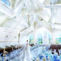 【AM参加は入場体験あり】横浜でも希少なスケールを誇るガラスのチャペル。天井高10m、バージンロード20mというスケールで、都心とは思えないほど空と青が広がる空間で誓いを