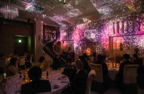 プライベートガーデンでのゲストとのドレス全身での写真撮影付のウェルカムパーティーから始まり、天井高を活かした会場ならではの階段入場やケーキ入刀など、様々な演出で盛り上げてきた披露宴の中でラストはプロジェクションマッピングでの演出で締めくくり!会場のボルテージは最上級となり皆様の記録にも記憶にも残る1日となりました!