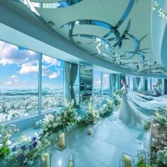 地上140m、スカイチャペルでの絶景体験。新郎新婦それぞれの歩んできた道を表す、左右に広がるバージンロードはゲストの心に残る感動シーンを演出。まるで空の上にいるかのような、挙式体験をゲスト目線で体感。