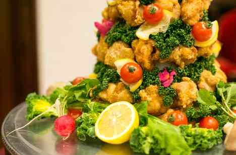 おふたりのことをよく知るゲストにも、「夫婦」としてのふたりを知ってほしいと進行を工夫。「新婦様が初めて新郎様に手作りされたお料理」である「からあげ」での演出や、「一生ふたりでおいしいものを食べましょう!」という想いをアナウンスしたファーストバイトなどで大盛り上がり。お料理は、吹奏楽のサークルで出会われたおふたりらしく五線譜のソースアレンジや、楽曲に見立てたメニュー名でゲストへサプライズ!