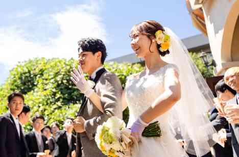 新郎様がチャペルへとご入場されると、続いてお兄様にエスコートいただきながらご入場された新婦様。 新婦様を託すかのように固く交わされた握手が、深く心に残るバトンタッチシーンとなりました。 リングサポートやブーケサポートなど、たくさんのゲストにご協力いただき、アットホームな挙式に。 ガーデンでのアフターセレモニーで幸福ムードがさらに高められ、かけがえのないお時間が創り上げられていきました。
