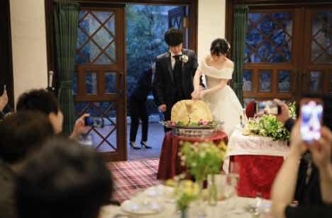 ゲストの視線を奪ったのは、巨大な揚げ餃子。オリジナリティを表す演出として、“餃子開き”を採り入れられました。木槌を振るって開かれた餃子のなかからあふれたのは、たくさんの小さな餃子。おふたりで味わわれたのちに、水餃子にしてゲストへ振舞われました。お腹も心もいっぱいに満たしていただきたいと、こだわったお料理のおもてなし。ホームパーティのようにリラックスしながら愉しまれていました。