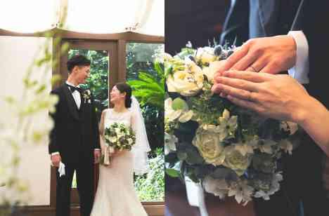 会場を華やかに彩るのは、ふんだんに採り入れたグリーンと愛らしい小花たち。ゲストを身近に感じられるような空間も意識されました。また、ゲストと創り上げる結婚証明書には、サンドセレモニーをアレンジしたとっておきのものをご用意。砂ではなく、4種類のコーヒー豆を使用した“コーヒービーンズセレモニー”で、大切なゲストとの想いを重ねられました。