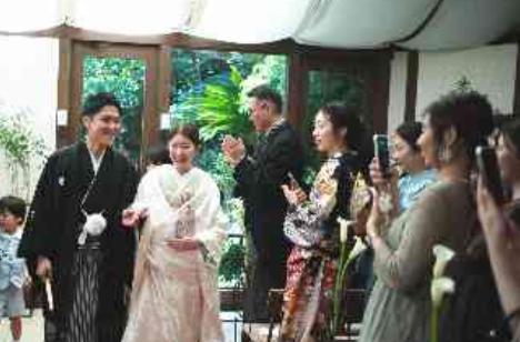ゲストの方々に、誓いの瞬間を近くで感じてほしいという想いがあったため、挙式はL字型のレイアウトで執り行いました。 ご両家の親御様にお仕度を整えていただき、挙式がスタート。 アットホームな雰囲気の挙式にしたいというお考えから、誓いのハグを。 エンドロールムービーの使用曲が「手と手を」という曲だったため、当日急遽ハイタッチを行うことに。さらにゲストとの距離が近くなることができた演出となりました。