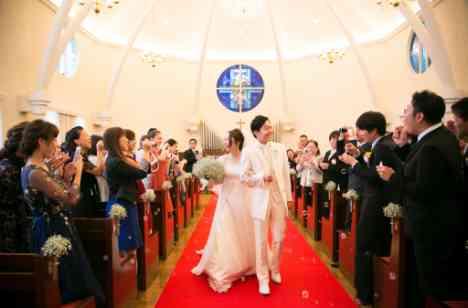 おふたりが誓いの場所に選ばれたのは、「北野異人館 旧クルペ邸」に隣接し、真っ赤なバージンロードと、祭壇にあるブルーのステンドグラスが印象的な独立型チャペル「神戸北野教会」。結婚式当日は、新郎様の姪御様によるフラッグの先導からスタートし、ドーム型の天井に響くパイプオルガンの音色や、神父様のあたたかな言葉など感動的なシーンにゲストの皆様も思わず涙が。祝福に包まれたセレモニーをかなえられました。