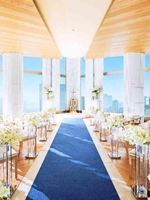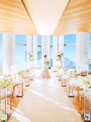 白と木目が基調のナチュラルで上質なインテリアを配した〝天空チャペル"。パノラマの絶景が広がりたっぷりの自然光が差し込む空間は、花嫁がより美しく映える。