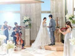 やわらかな光を感じながら、目の前に広がる絶景に包まれる天空のチャペル。逆光にならないよう石造りの祭壇、温かみある木目調の天井、そして弦楽四重奏の美しい音色が新たな門出に百花を添えます。チャペル内で集合写真を撮ることができるのも魅力!