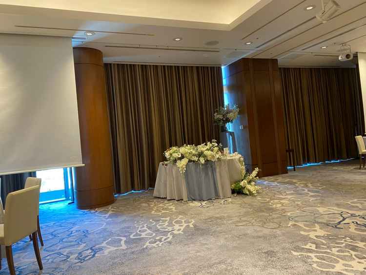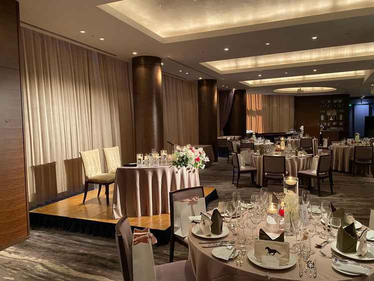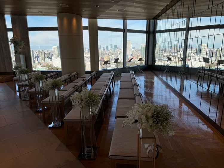 高層階からの景色は綺麗で、自然光がとても明るくすてきな会場でした。カーテンの開け閉めなど高層階の景色を生かした演出もありました。