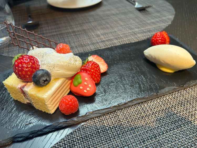 パンとスープ、フォアグラの乗ったお肉、ケーキをいただきましたがいずれもとても美味しかったです。 見学時のアンケートで好きな食べ物に苺と記載していたら、デザートが苺のケーキだったのも嬉しかったです。