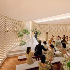 【25年NEWオープン】温かみのあるナチュラルなデザインと、柔らかな光が花嫁を優しく包み込む。円を描く天井や壁面の照明など、自然とふたりへ視線が集まるよう工夫がほどこされた全天候型のチャペル。
