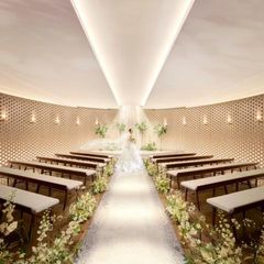 全天候型チャペルには、職人の手で仕上げられた天然石の壁と大理石のバージンロードが。やわらかな光に包まれ、ふたりを引き立てる設計で、心静かに誓いの時を迎えられます。 -